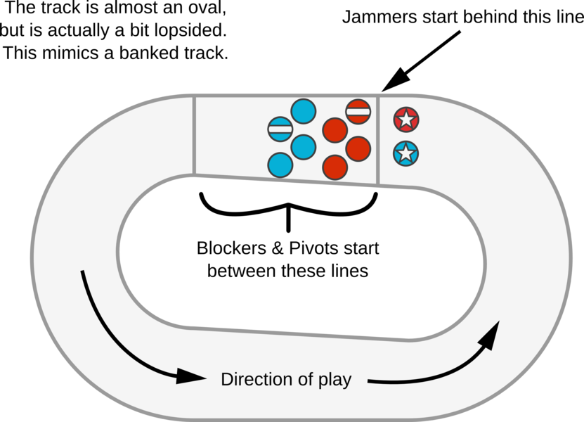 Game play consists of a series of short scrimmages (jams) in which both teams designate a jammer (who wears a unique designation on the helmet; currently a star) and four blockers. The jammer scores points by lapping members of the opposing team.